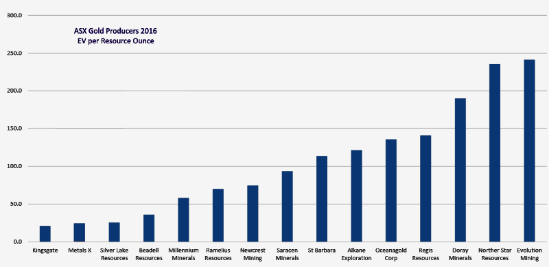 ASX listed gold producers: Enterprise Value per Resource Ounce 2015-2016