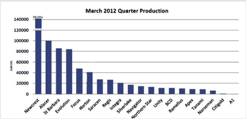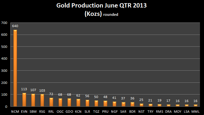 The chart above shows Australia's top 20 on-shore gold producers in the June quarter of 2013.