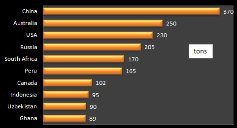 See Australia's historical gold mining production figures. Australia was in 2012 the world's second largest producer with 250 tons produced. See chart - This represents a 20 ton decline from 2011.